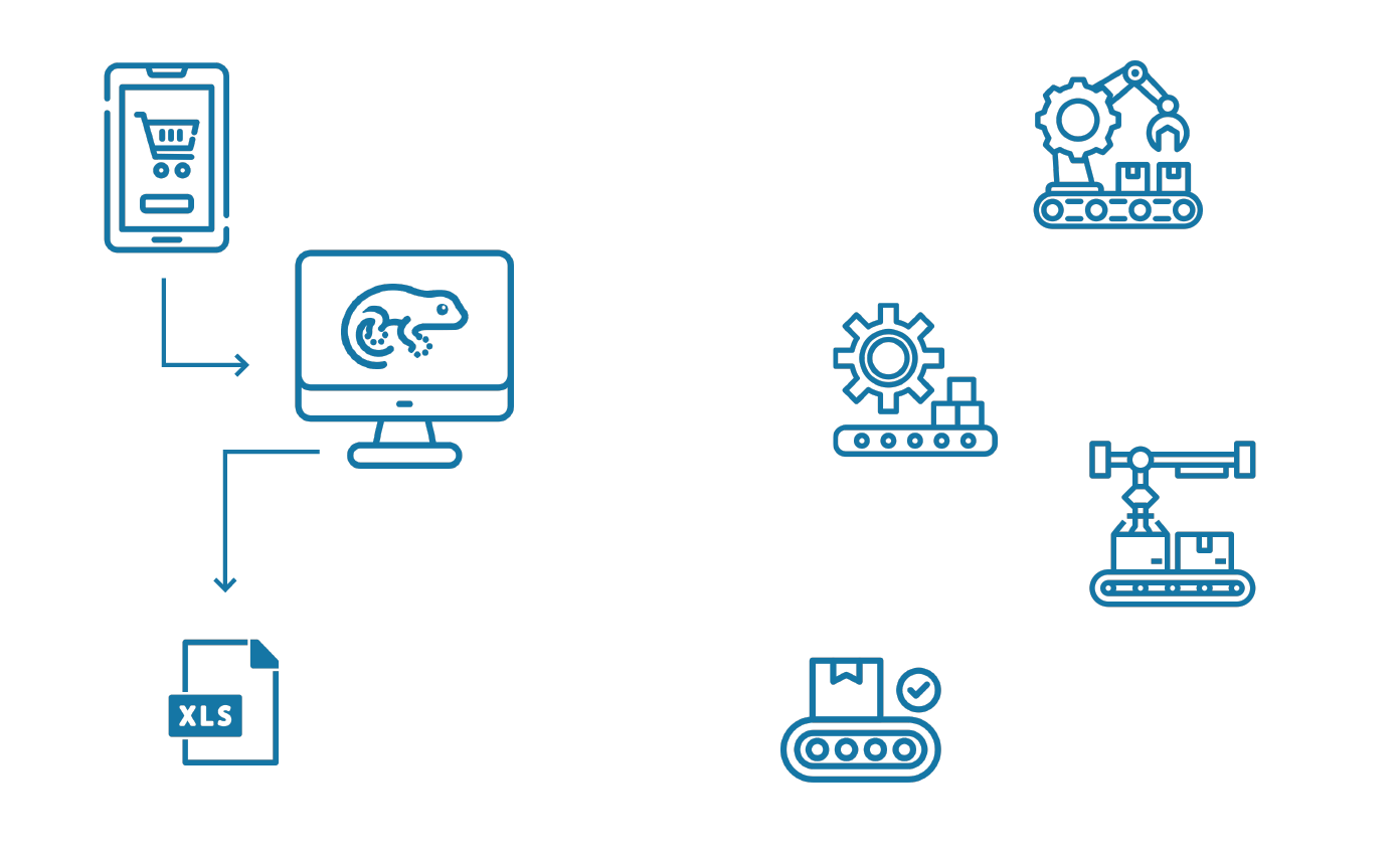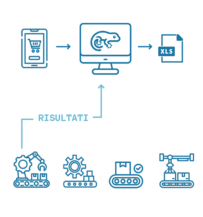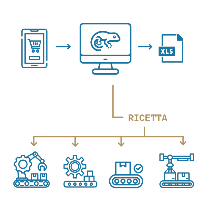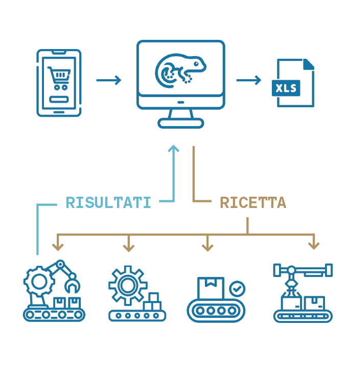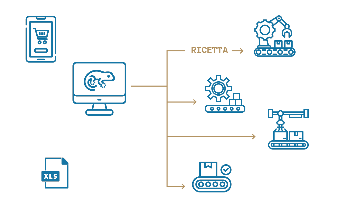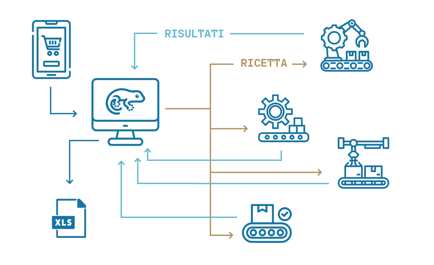 Un software modulare e scalabile che utilizzando container Docker per ogni componente fa comunicare i componenti del processo produttivo tra loro in modo omogeneo utilizzando interfacce REST/JSON e database distribuiti/condivisi.
